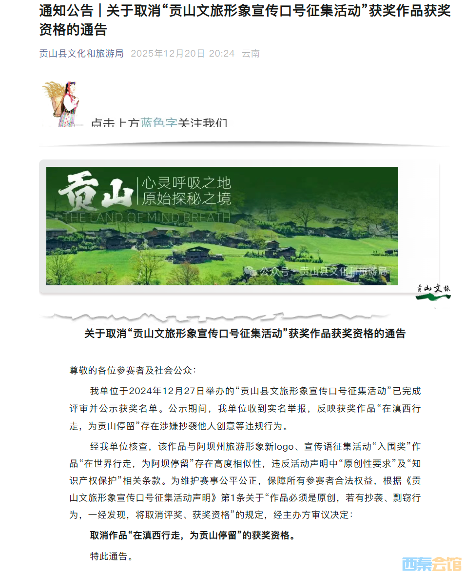 12月20日晚,云南怒江州贡山县文化和旅游局发布通告,宣布“贡山县文旅形象宣传口号征集活动”的一则获奖作品确认抄袭10年前四川阿坝州的宣传语征集活动获奖作品,决定取消其获奖资格。